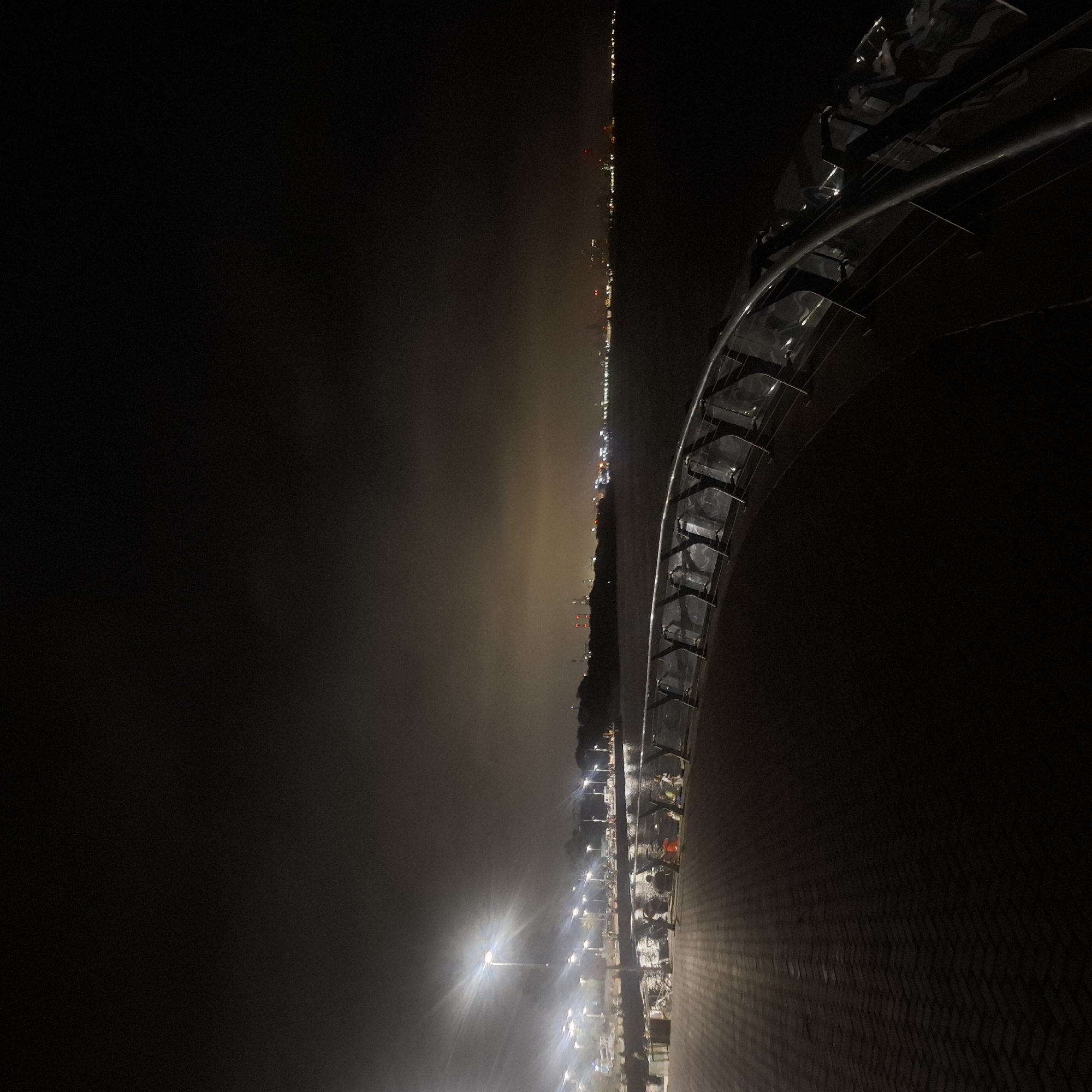 At night, a photograph shows a coastal area in Villa Domínico, Argentina, featuring a curved structure on the right with visible metal bars and translucent panels. The left side of the image depicts a dark, hazy sky and horizon where the presence of the coastline is marked by numerous street lights and possibly distant buildings. The ground below the structure exhibits a textured surface, presumably paved, leading toward a walkway illuminated by streetlights. There are hints of figures along the walkway, suggesting people present in the scene. The overall ambiance suggests an urban coastal environment under conditions of low visibility.
