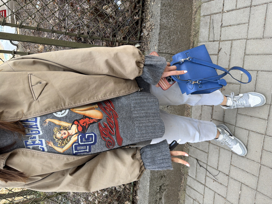 The image displays a person standing on a paved sidewalk in an urban setting within Sofia, Bulgaria. The individual is shown from the upper chest to the feet, centered in the frame. The person wears a light beige, long-sleeved zippered jacket, unzipped to reveal a grey knitted sweater. The sweater features a prominent graphic of a blonde pin-up woman in a red swimsuit, with "DOLCE & GABBANA" and "ITALY" text. The jacket has a small triangular flap pocket on the upper right side, and both the jacket and sweater have ribbed cuffs visible at the wrists. Light grey jeans are worn, leading down to grey and white high-top sneakers with black accents, identifiable as Air Jordan 1s. In the person's right hand, a brown-cased smartphone is held, along with a small, structured royal blue leather handbag, resembling a Hermes Kelly style, equipped with a top handle and a visible shoulder strap. The left hand holds a small, black, cylindrical object, possibly an e-cigarette or vape pen. The fingernails on both visible hands are painted white. The environment consists of a sidewalk paved with rectangular grey pavers. A concrete curb runs along the edge of the sidewalk. Behind the curb, a metal chain-link fence is visible, beyond which sparse, bare tree branches and a portion of a light-colored vehicle, likely white, can be discerned in the background.