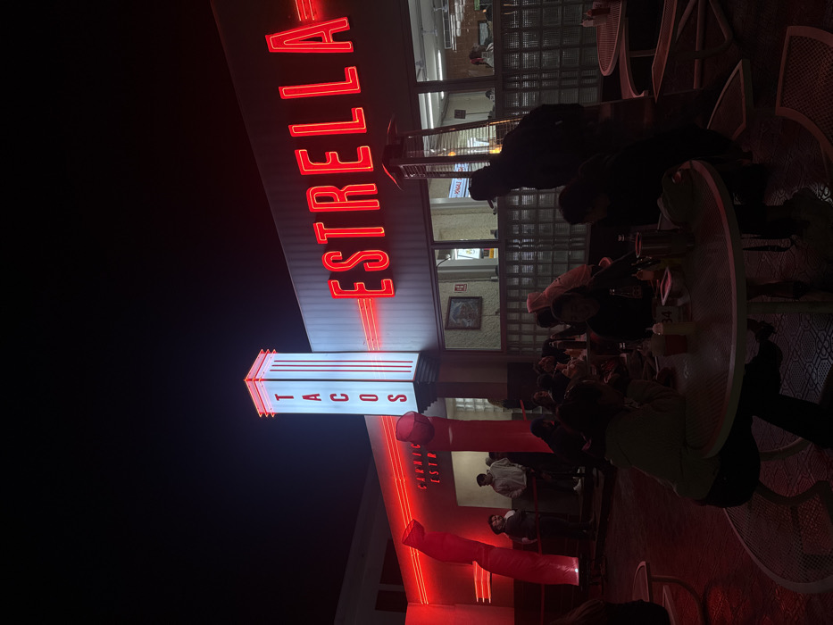 A bustling outdoor scene at night features "Estrella" and "Tacos" neon signs