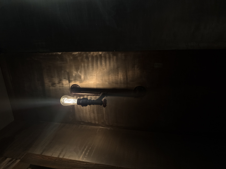 The scene depicts a dimly lit interior in Yerevan, Armenia. A functional, industrial-style light fixture is mounted vertically on a wall. This fixture is constructed from dark metal pipes and fittings, with an illuminated Edison-style filament bulb at its apex. A small control valve or knob is integrated into the pipe structure below the bulb. The bulb emits a warm light, casting an upward beam and illuminating the immediate wall surface. This wall section, to the left of the fixture, is dark and textured, reflecting light in irregular, wavy patterns. A distinct vertical seam separates this area from a uniformly darker, almost black wall surface on the right. No individuals, activities, or additional objects are present in the visible area.