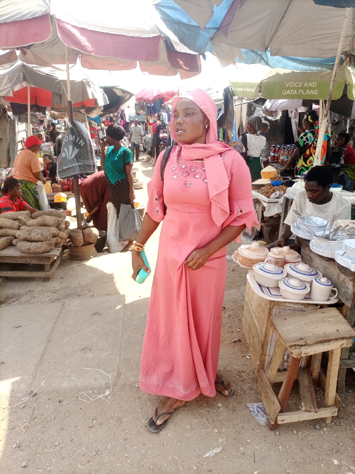 This image depicts an outdoor market scene in Zango-ndaji, Nigeria. The environment consists of a partially paved and predominantly dirt ground, with numerous stalls shaded by multiple large, colorful market umbrellas (pink, light blue, white, grey). Strong sunlight casts defined shadows. In the foreground, a female with light brown skin, approximately 20-30 years old, stands angled slightly left, looking towards the right. She wears a long, salmon-pink dress (abaya-style) adorned with silver embellishments on the chest and sleeves, a matching pink hijab, and dark flip-flops. Multiple gold-colored bangles are visible on her right wrist. She holds a light blue object in her right hand and lifts a portion of her dress with her left. A black backpack is on her left shoulder. To the left of the central figure, a stall displays a significant pile of large, brown yams on a wooden pallet. A woman in an orange top and red head covering is seated near these yams, with another individual in a red top also present. Further back, a person in a green top and dark skirt stands near a black plastic bag hanging from a pole. To the right of the central figure, a male in a light-colored t-shirt is seated behind a wooden stall. This stall displays various items, including a white tray holding several white ceramic or plastic bowls with blue striped patterns, lidded containers, and mugs. Other goods, such as bottles and small brown items, are also visible on the stall. An overhead green sign reads "VOICE and DATA PLANS," with a partially visible sign to its left mentioning "The largest 4G Network." Numerous other individuals, both vendors and shoppers, are visible throughout the midground and background, indicating active market commerce.