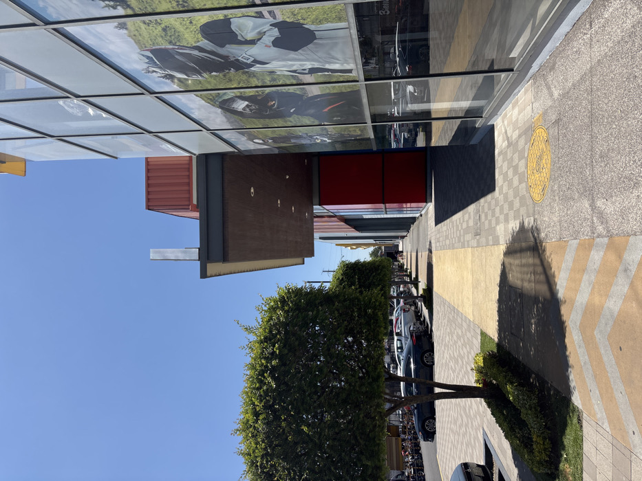 The image depicts an outdoor commercial or urban environment in San Pedro Cholula, Mexico, under a clear, bright blue sky with strong sunlight. The scene is dominated by a modern building on the right, featuring a multi-story glass curtain wall facade that reflects parked vehicles and the sky. Embedded within the glass are large promotional graphics showcasing individuals wearing motorcycle helmets and protective gear against a green, hilly landscape. A dark, flat canopy with recessed lighting extends over a pedestrian walkway from this building. Below the canopy, a section of the building is clad in red paneling. The ground consists of a paved walkway, transitioning from patterned gray aggregate to a solid yellow-tan strip, then to gray pavement with yellow chevron markings. A circular yellow manhole cover is present on the gray aggregate. To the left, a linear row of small, rounded deciduous trees with dense green foliage stands in landscaped beds with low green shrubs. Beyond the trees, a paved parking area is visible, containing several parked vehicles, including dark sedans and white trucks. Further down the street or lot, numerous motorcycles or all-terrain vehicles are densely parked. The building's upper structure features a reddish-brown, possibly corrugated, element and a vertical, reflective silver architectural piece extending upwards. No people are distinctly visible performing actions or engaging in interactions within the primary focal areas of the image, aside from the figures depicted in the promotional graphics on the building facade.