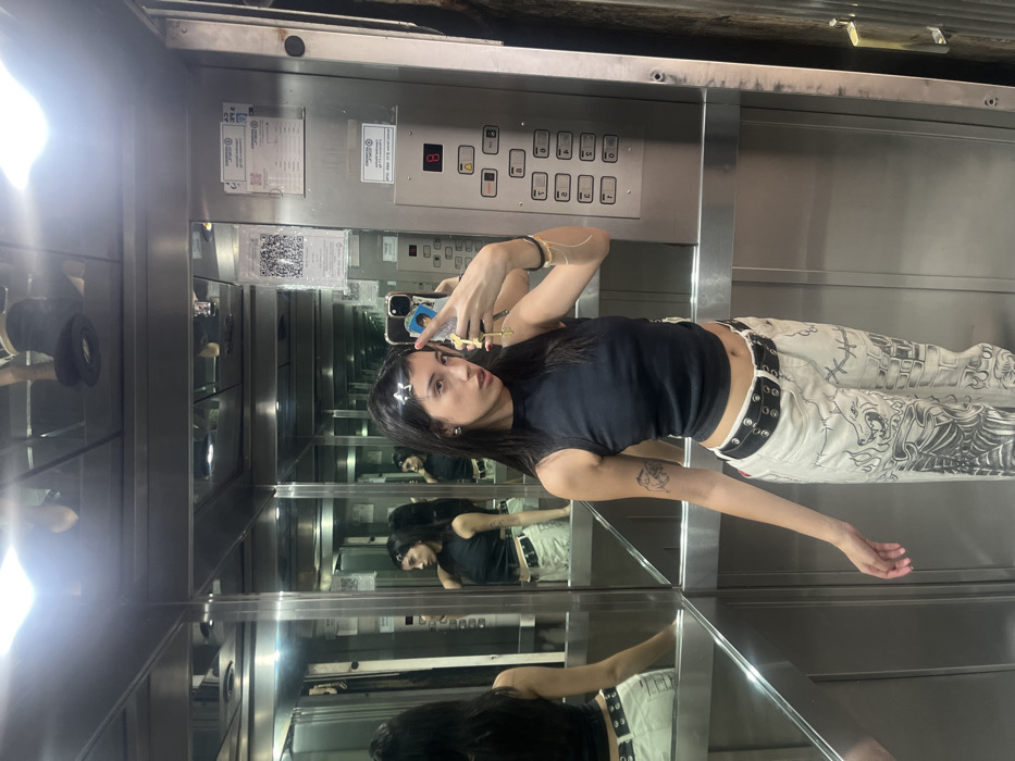 A woman takes a selfie in an elevator with mirrored walls, creating multiple reflections. She wears a black tank top, patterned white pants with a black belt, and has star-shaped clips in her dark hair. The elevator control panel is visible in the background. The image is sideways.