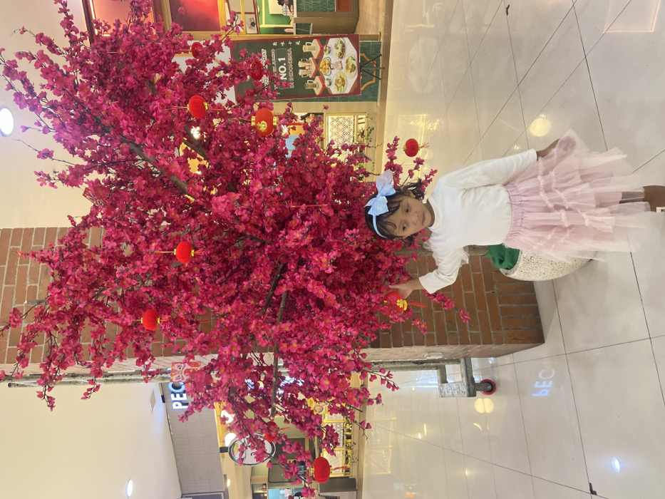 - "A young girl is depicted standing in a shopping mall in Sidoarjo, Indonesia, in front of a large artificial pink cherry blossom tree" by FM-htxI33, licensed under CC BY 4.0