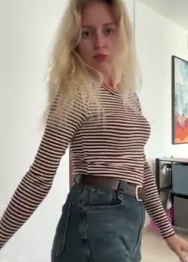A fair-skinned woman with wavy blonde hair dances in a brightly lit indoor space. She is wearing a long-sleeved, brown and white striped shirt, dark wash jeans with a brown belt, and is facing the camera. She moves her arms and touches her hair, seemingly enjoying the music in the background. The room has white walls, and in the background, there is a doorway, a small table with items on it, and a framed picture on the wall.