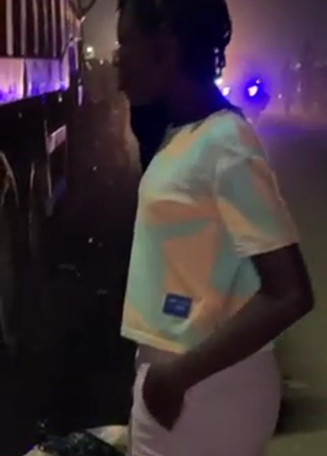person standing next to a large vehicle at night. The person is facing away from the camera, but their profile is visible. They appear to be wearing a tie-dye shirt and pink pants. Their hair is styled in braids. The background is blurry, but it appears to be a street with other people and vehicles in the distance. There are flashing blue lights, possibly from emergency vehicles. The atmosphere is hazy or smoky.