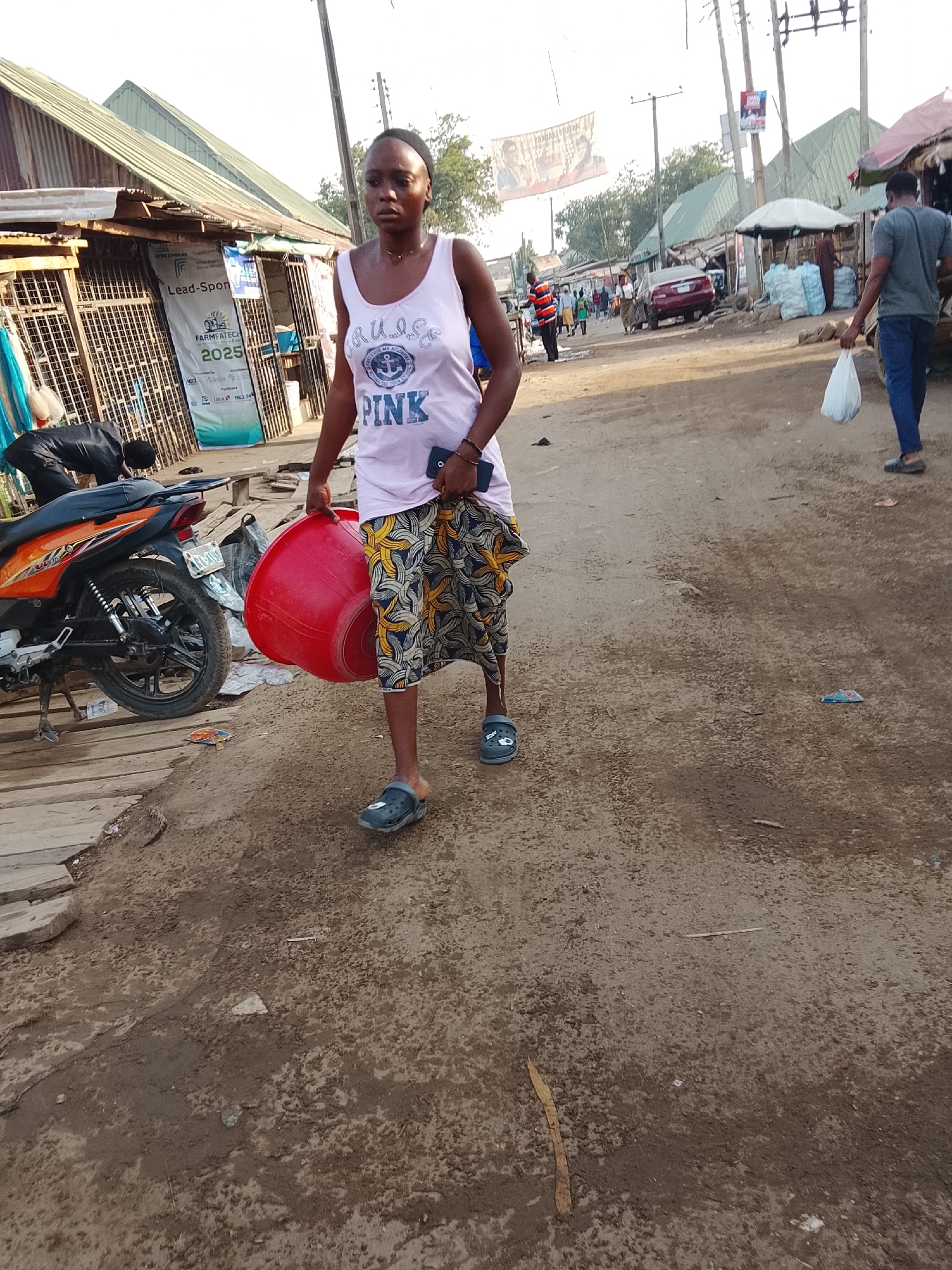 The image depicts an informal market or street scene in Abuja, Nigeria. In the foreground, an adult female, appearing to be in her 20s or 30s, walks towards the viewer on a dirt path. She wears a light pink sleeveless tank top with "CRUISE" and "PINK" printed on the front, a patterned yellow, black, and white long skirt, and dark blue clogs. She carries a large red plastic basin in her right hand and a dark-colored smartphone in her left hand. A dark hairband is visible on her head. To her left, an orange and black motorcycle is parked on a raised wooden platform alongside a row of market stalls constructed with corrugated metal roofs and metal security grates. A person in dark clothing is bent over near the motorcycle. A small, light-colored dog stands under the motorcycle. A large banner on one stall partially reads "Lead-Spon" and details "FARMFATECH 2025" with logos for Afreximbank, UBA, and NEXIM. The dirt path extends into the midground and background, revealing a busier section of the market. On the right, an adult male walks away from the viewer, carrying a white plastic bag in his left hand, wearing a grey t-shirt and blue jeans. Further back, a dark red sedan is parked facing away from the viewer. Multiple utility poles with overhead wires and banners are present, including a large banner hanging across the street featuring two male figures. Additional market stalls with canopies and stacks of bags are visible. Several other individuals are dispersed throughout the background, engaged in various activities. The ground consists of dry, uneven dirt with scattered debris under natural daylight.