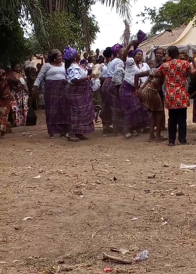 group of people gathered in an outdoor space, likely for a celebration or cultural event. Most of the people are women, wearing a combination of white tops, purple plaid wraps, and purple head coverings. They are dancing together in a circle on dirt ground. A few people are standing around the dancers, observing. The environment includes trees, a building in the background, and litter scattered on the ground. One person is wearing a leopard print dress and another is wearing a red shirt with a print of various faces.