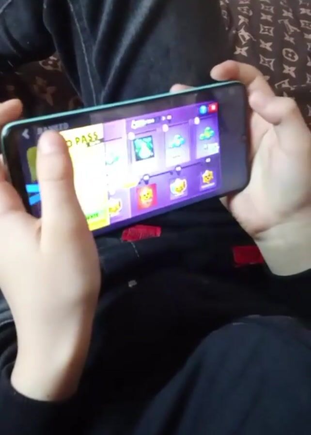 A person is holding a smartphone in their hands. They are sitting in a relaxed position, with their legs bent. The smartphone displays a game with bright, cartoon-like graphics. The person's fingers are moving across the screen, presumably interacting with the game. The background includes a patterned surface, possibly a bed or couch cover. The person is wearing dark-colored clothing, including jeans.