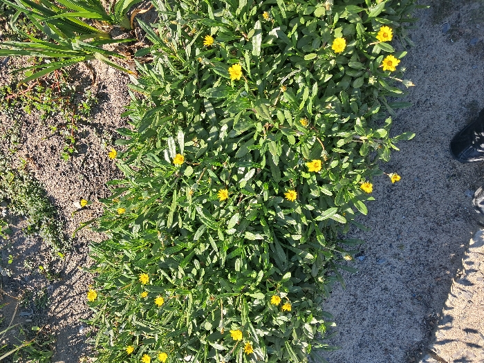 The image depicts an outdoor ground-level scene in Kraaifontein, South Africa. The foreground features a light grey concrete path. In the bottom-right corner, the toe of a dark-colored athletic shoe is visible. Adjacent to the concrete path, a dense patch of low-growing green plants, interspersed with numerous small, bright yellow flowers, occupies the central and upper-left portions of the frame. Behind this flowering vegetation, areas of exposed brown soil with sparse smaller plants are visible. In the upper-right quadrant, a plant with upright, strap-like green leaves protrudes from the soil. The scene is illuminated by natural sunlight, casting distinct shadows onto the concrete path.