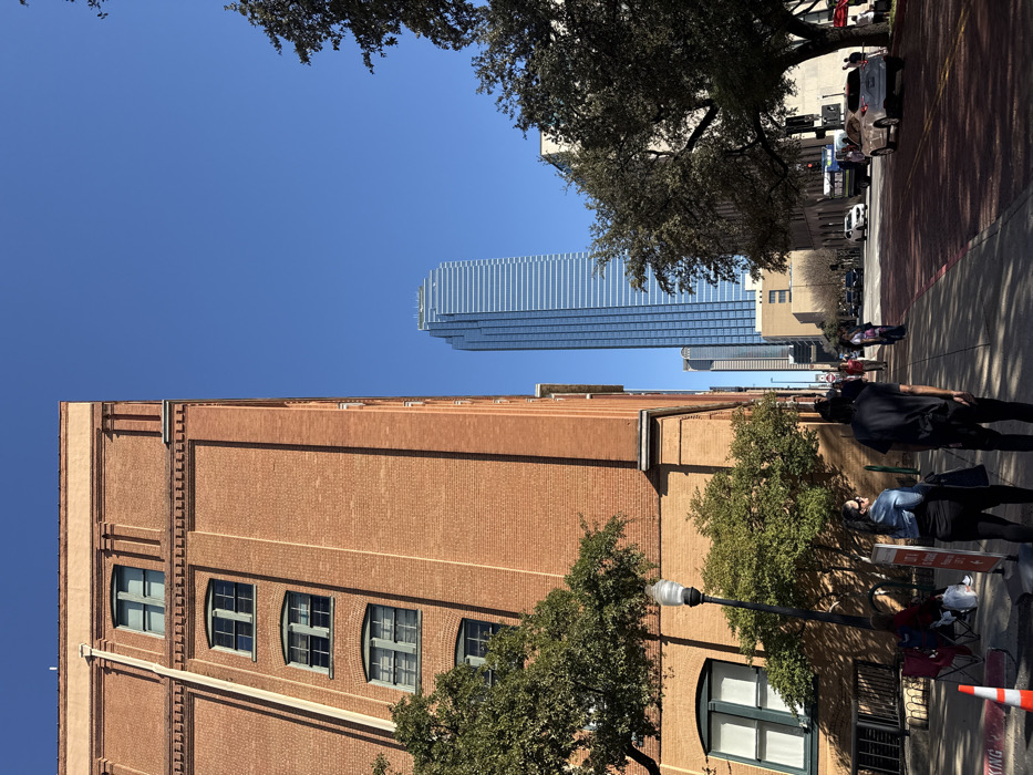 An eye-level, outdoor shot depicts a brick building with windows on the left, contrasting with a towering glass skyscraper in the distance under a clear blue sky. A sidewalk bordered by trees features several people, cars, and other buildings. The image is vertically oriented and tilted.