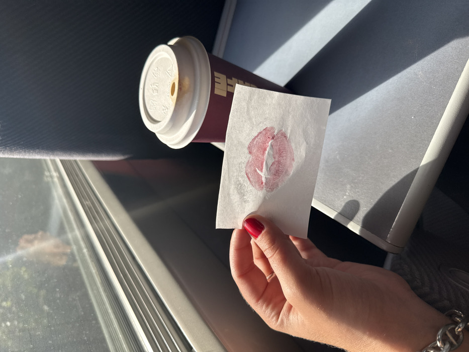 An image taken inside a train or similar vehicle depicts a hand holding a piece of paper with a lipstick print, alongside a coffee cup