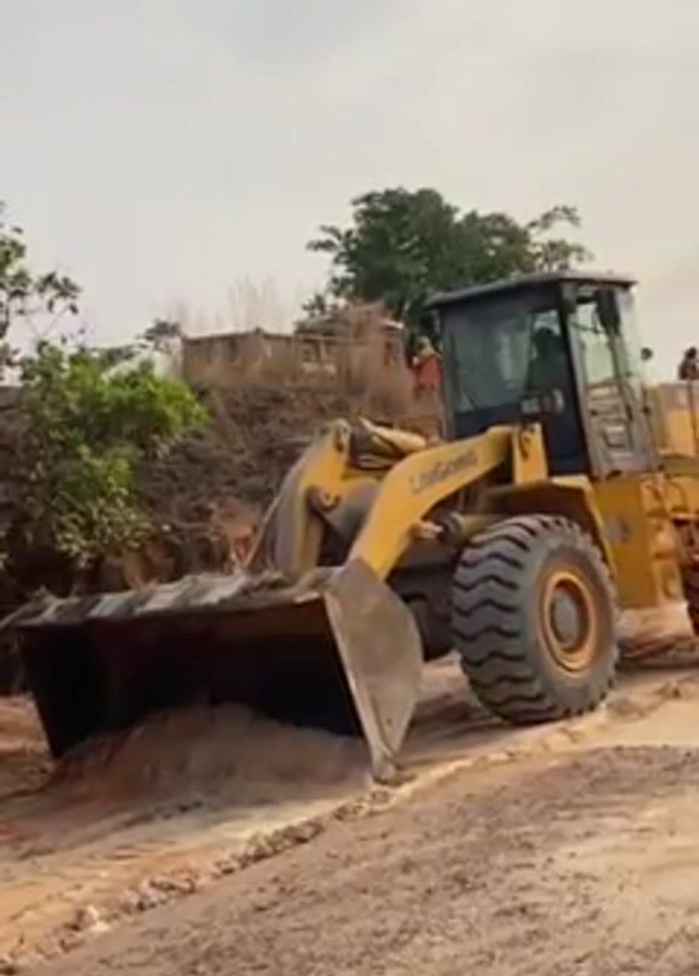 A yellow LiuGong wheel loader is shown operating on a dirt surface. The loader's bucket is filled with dirt. The loader moves forward and then stops. Vegetation is visible in the background. Several people are seen standing further back on a raised dirt mound. The sky is overcast.