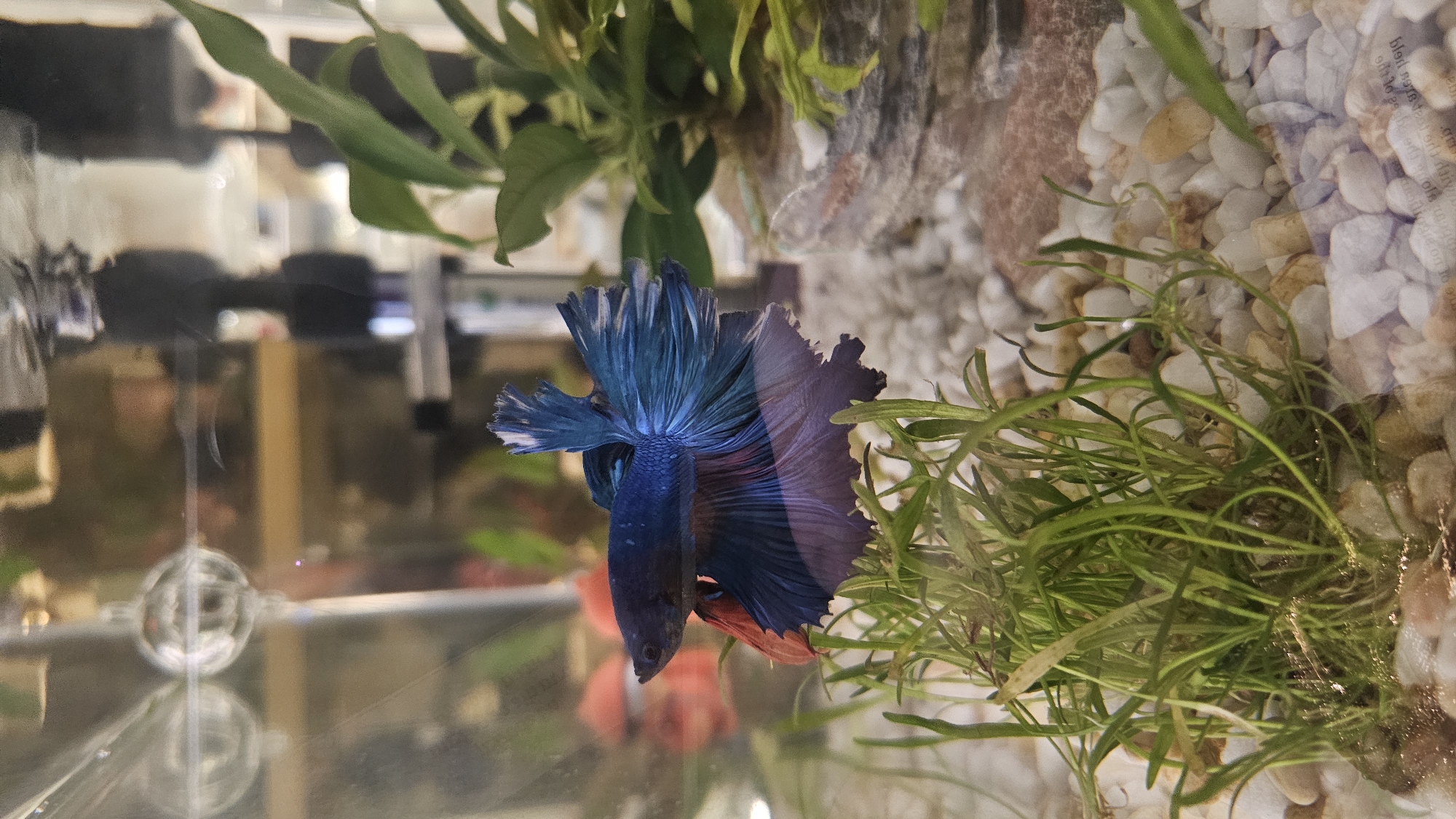 The image displays a male Betta splendens (Siamese fighting fish) inside an aquarium. The fish exhibits a dark blue body that transitions into vibrant blue and teal fins, with reddish-orange coloration evident on its ventral and anal fins. Its large caudal fin is flared in a distinct fan shape. The fish is positioned in the water column, oriented towards the left. The aquarium environment includes a substrate composed of small, irregular white and light beige pebbles. A cluster of thin, bright green aquatic grass-like plants occupies the foreground. To the right, a broader-leafed green aquatic plant is situated within a textured, greyish-brown pot or rock structure. Visible aquarium equipment includes a spherical clear object, likely an air stone or aerator, near the water surface, and black cylindrical components, possibly part of a filter or heater, visible behind the right-side plant and as reflections. The background, visible through the tank and as reflections on the water and glass, consists of blurred indoor elements, including a prominent orange-red object situated behind the fish. The water inside the tank is clear. The specified location in the city of Bistritsa, Bulgaria, cannot be independently verified from the visual content of the image.