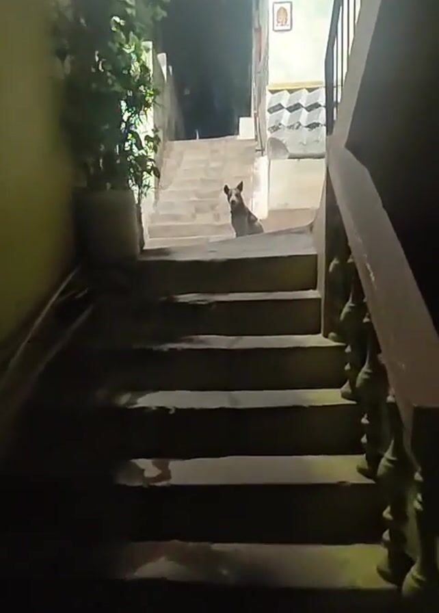dog sitting on a street at night. The camera is positioned at the bottom of a set of stairs, looking up towards the street. The street is dimly lit. The dog is medium-sized with a white and brown coat. The dog is sitting upright and facing the camera. There is a plant in a pot on the left side of the stairs. The buildings on either side of the street are old and have some decorative elements.
