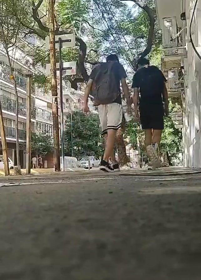 Two young men walk away from the camera, down a concrete sidewalk in a residential neighborhood. The man on the left wears a dark t-shirt, light-colored shorts with dark trim, a brown backpack, and dark shoes. The man on the right wears a dark t-shirt, dark shorts, a dark backpack, and light-colored shoes. Both men have short dark hair. They are walking away from the camera down a sidewalk between apartment buildings, under the shade of large trees. A street with cars parked along the side is visible in the distance. A utility pole is on the left.