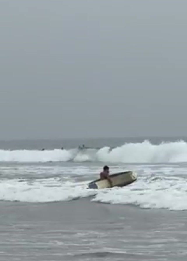 surfer kneeling on a surfboard in the ocean, with waves breaking behind him. There are other surfers visible further out in the water. The sky is overcast. A child walks along the beach in the foreground. The surfer transitions to a sitting position on the board.