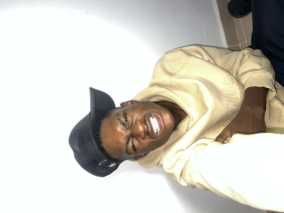 A young Black man with a black baseball cap and tan hoodie is shown from the chest up. He is smiling widely and clenching his teeth. The hoodie has the word "ESSENTIALS" printed on the arm. He has dark hair and appears to be indoors, next to a white wall and a man wearing a dark outfit. The photo is taken at an angle.
