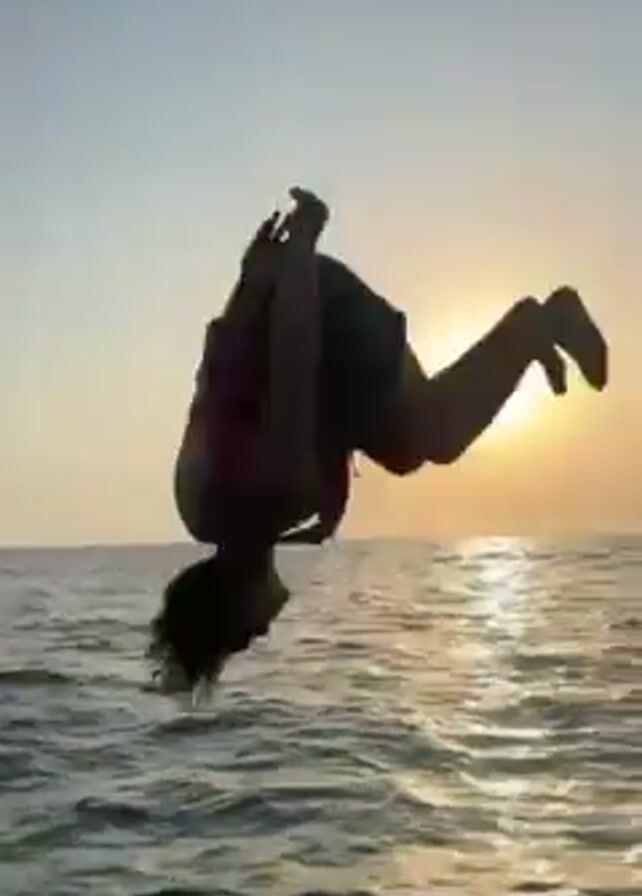 A person, silhouetted against a bright sunset, is seen jumping off the side of a boat into the water