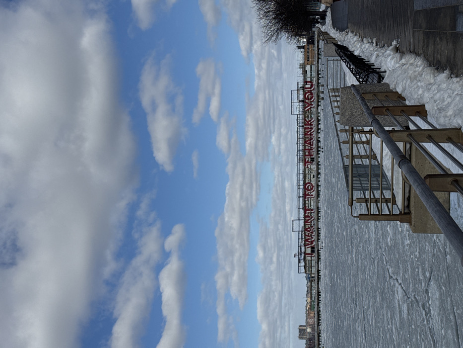 A waterfront scene with a clear sky above featuring fluffy clouds. A metal railing borders a frozen body of water, with snow visible along the walkway. Red lettering "I WANT TO THANK YOU" is visible on a structure along the water's edge. The image is rotated sideways.