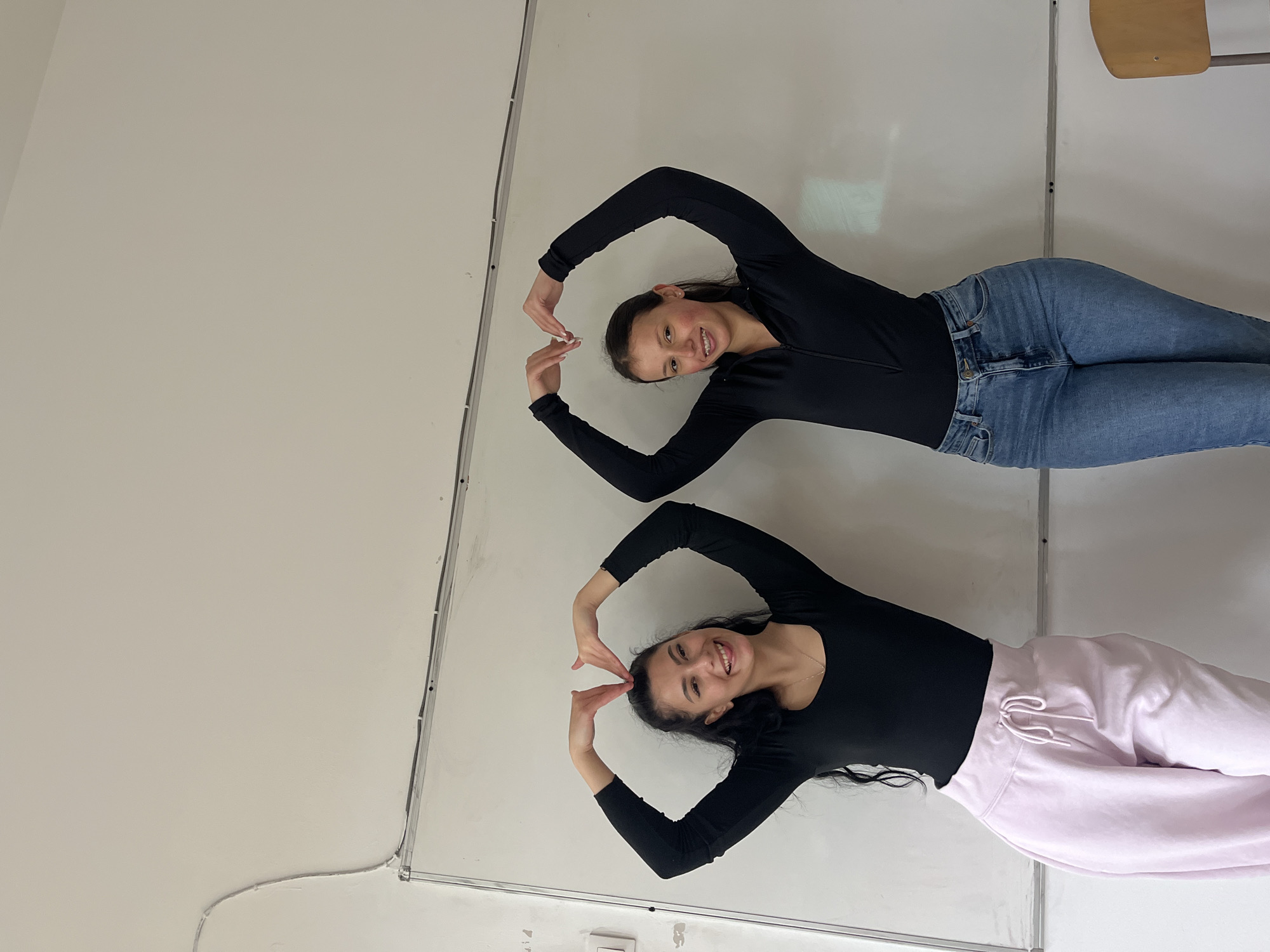 Two women are standing in a room. They are both wearing black long-sleeved shirts. One woman is wearing blue jeans and the other is wearing pink sweatpants. They are both making heart shapes with their hands above their heads. The background is a white wall with metal trim. The location is Karnobat, Bulgaria.