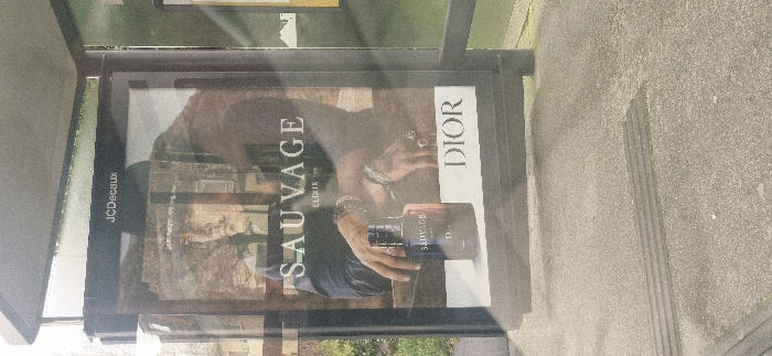 A bus stop shelter in the city of Avion, France, is captured from a slightly elevated perspective, showcasing a JCDecaux advertising display. The primary subject is a large poster behind a reflective glass panel within the dark-framed shelter. The poster depicts a male figure, appearing to have long dark hair, a mustache, and wearing a hat. His hands, adorned with multiple rings and bracelets, are prominently featured, with one hand holding a dark, square-shaped fragrance bottle labeled "SAUVAGE ELIXIR". The brand name "DIOR" is displayed in large capital letters at the bottom right of the poster. Reflections on the glass panel partially obscure the advertisement, showing blurred images of tree branches and light-colored building structures in the background. The ground in front of the shelter is a light grey, granular concrete surface. A rectangular strip of tactile paving, featuring three parallel raised ridges, is horizontally embedded in the concrete near the bottom center of the frame. No individuals are physically present or interacting with the bus stop in the image. The environment is an urban setting, observed under bright, diffused daylight.