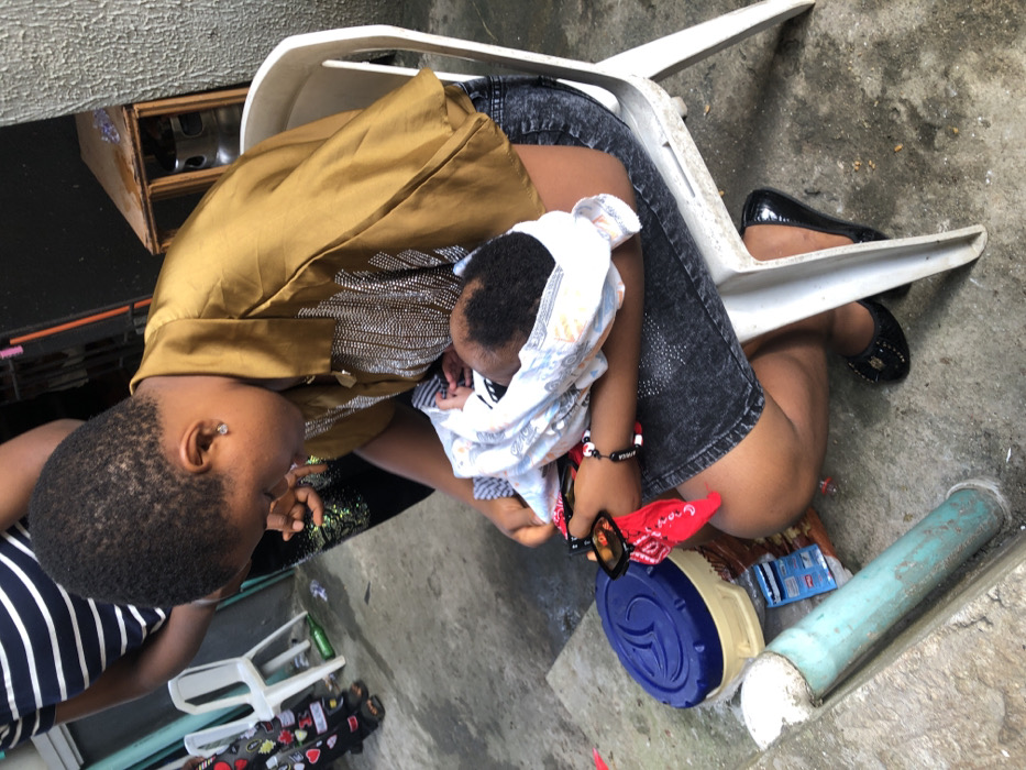 A woman sits outdoors on a white plastic chair, holding a baby wrapped in a patterned cloth. She is dressed in a gold top and dark shorts. The baby is positioned against her chest. Next to the woman is a blue and cream-colored object, and further away is a blue pipe. The ground is concrete. Additional chairs and objects are scattered around the area.