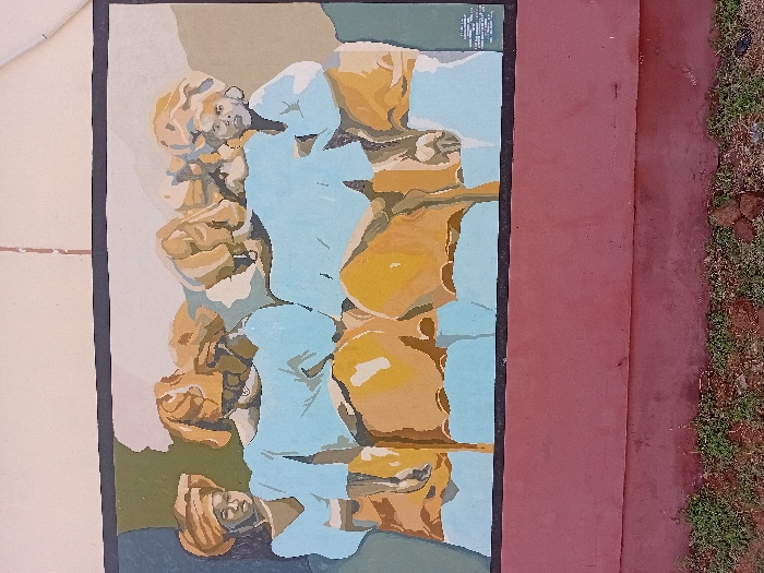 This image captures a multi-figure mural painted on an exterior building wall in Lokoja, Nigeria