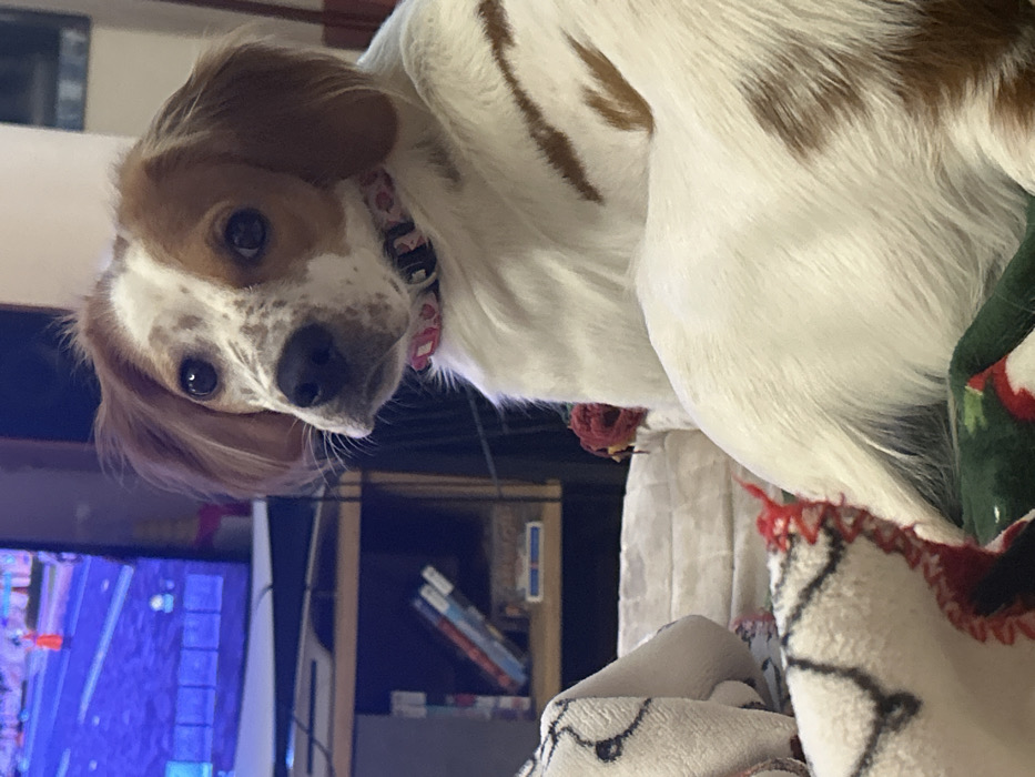 - "The image depicts a white and brown-spotted dog, possibly a Spaniel mix, positioned in an indoor domestic setting" by FM-MRhzP2, licensed under CC BY 4.0