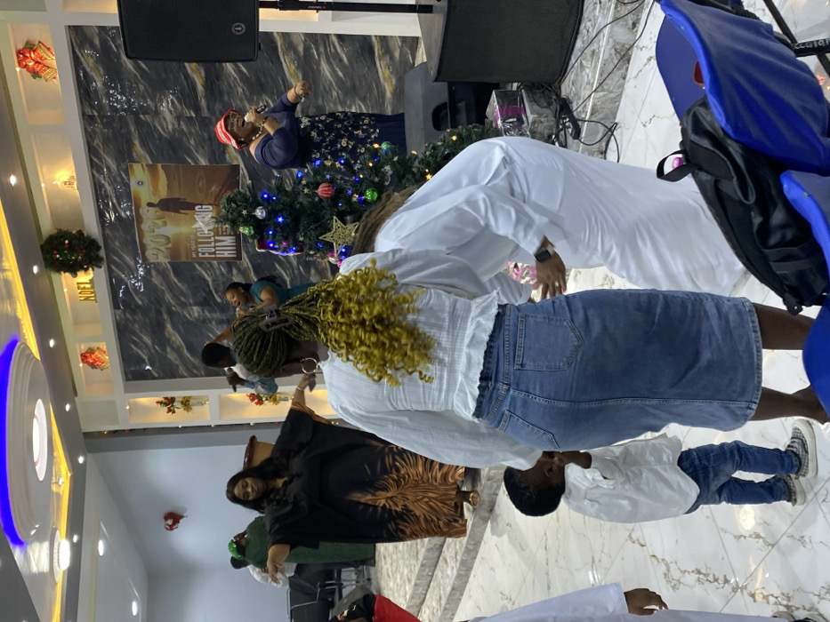 Inside a church, various individuals participate in a service. A woman in a red head covering sings near a Christmas tree. Several people stand around her, appearing attentive and involved in the proceedings. A poster reading "2024 Following Him" is displayed. The interior features marble-like walls, recessed lighting, and decorations. The scene captures a religious gathering with elements of the holiday season.