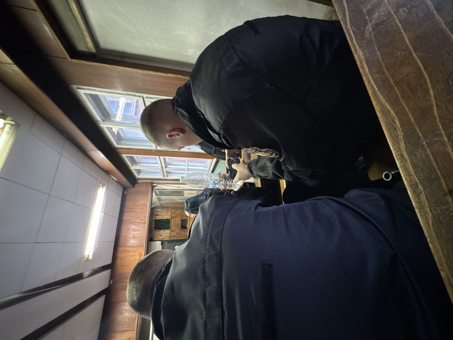 The image depicts an indoor scene within a building in Sofia, Bulgaria. Two male subjects, visible from behind, occupy the foreground, seated at a dark, rustic wooden table. The subject on the left wears a dark blue uniform-style jacket with a rectangular hook-and-loop fastener patch on the upper back. The subject on the right wears a black uniform-style jacket, featuring a multi-colored emblem (primarily red, yellow, and black) on the right sleeve. This subject is actively holding and interacting with a smartphone with both hands. A clear plastic water bottle is positioned on the table between the right foreground subject and a partially visible individual with dark hair seated further back. The room's environment includes wood-paneled walls, a white tiled ceiling with two exposed fluorescent light fixtures, and a series of multi-paned windows along the right wall. Through these windows, an exterior building structure is partially visible. A single metal ring or key is partially discernible on the floor or under the table in the lower-left portion of the frame.