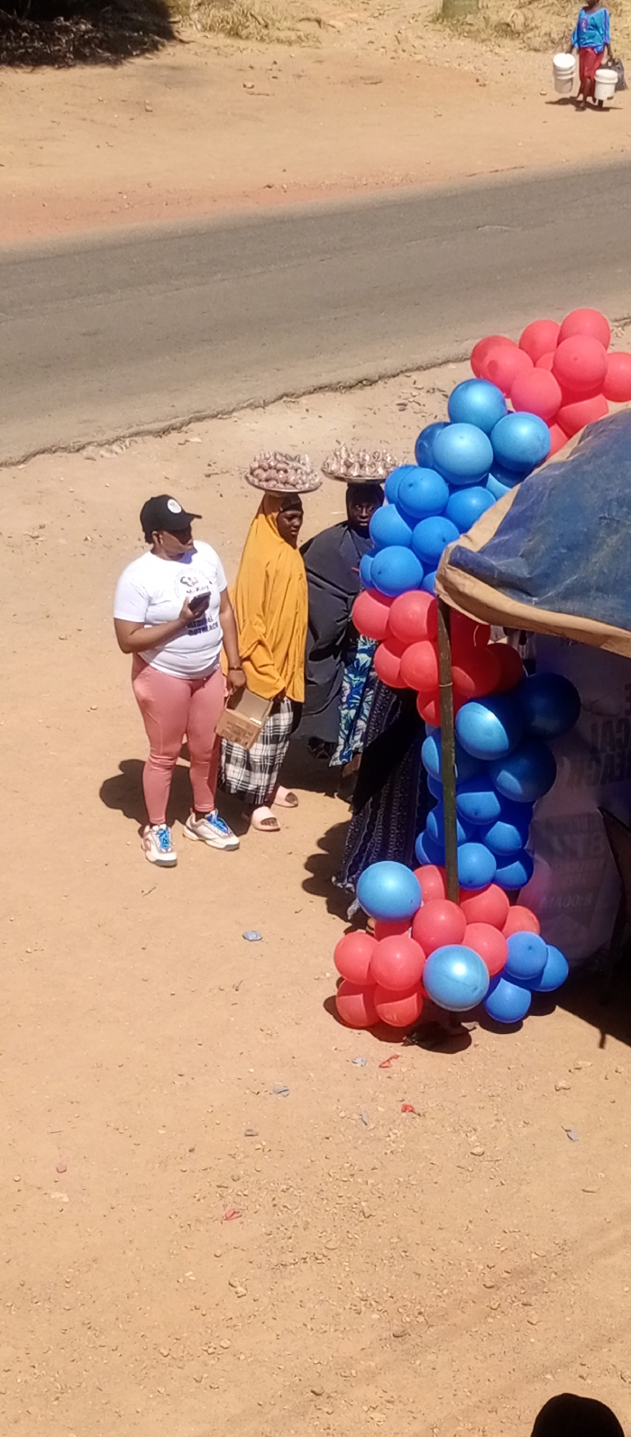 The scene, located in Gwong, Nigeria, depicts an outdoor environment under direct sunlight, featuring a reddish-brown dirt and gravel area adjacent to a gray paved road. In the mid-ground, a vertical display of red and blue balloons, arranged in clusters, stands next to a partial view of a blue tarp covering a structure. Three individuals are positioned near this display. The leftmost individual, wearing a white t-shirt, pink leggings, white and blue sneakers, and a black baseball cap, holds a dark smartphone in their left hand and a small brown box in their right. To their right, an individual in a yellow long-sleeved garment and plaid skirt balances a round, metal tray laden with numerous small, light-colored, spherical objects on their head and holds a small rectangular box. A third individual, dressed in dark clothing, also balances a similar tray of objects on their head. In the background, across the paved road, another individual wearing a blue top and a red skirt walks on the dirt shoulder, carrying two white buckets.