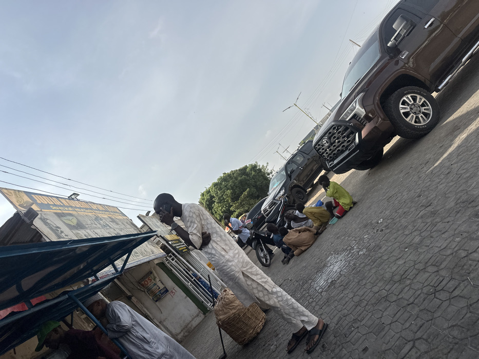 The scene depicts an outdoor urban environment in Unguwar Sarki, Nigeria, under a bright, clear daytime sky. The ground is paved with gray interlocking bricks. In the foreground and mid-ground, a dark-skinned adult male, dressed in a light-colored, long-sleeved patterned tunic and trousers with dark sandals, stands on the left. He holds a black mobile phone to his left ear with his left hand, while his right arm is bent across his chest. To his immediate left, a large woven basket rests on the pavement. Partially obscured by a metal awning structure to the far left, another individual in similar light attire is visible. Further into the mid-ground, several individuals, appearing to be children or young adults, are seated directly on the paved surface. One is dressed in light brown attire, another in yellow-green, and others are partially visible. Small red and blue plastic containers are on the ground in front of some of these seated individuals. Vehicles are prominent in the right and central portions of the scene. A brown Toyota Tundra pickup truck is parked on the right, facing slightly left, displaying chrome wheels and a detailed front grille. Behind it, a dark-colored pickup truck and a motorcycle are also visible. In the background to the left, commercial buildings or stalls with corrugated metal roofs and signage are present. A sign above the awning features yellow lettering on a dark background, with visible text including "DESIRABLE MEALS." Green trees are visible behind the vehicles, and utility poles with overhead wires traverse the upper portion of the frame. The sky is a light blue with minimal cloud cover.