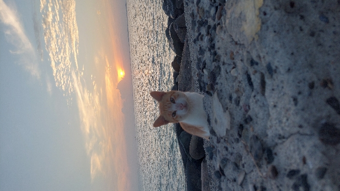 A lone, orange and white domestic cat is positioned centrally on a dark grey, pebbly concrete surface. The cat faces directly forward, its head slightly raised, with orange fur on its head and back, and white fur on its chest and face. Behind the cat, a line of dark rocks separates the foreground from a calm body of water that extends to the horizon. A sunset is visible in the background, with the sun appearing as a bright orange orb near the center-right horizon. The sky displays a gradient of light blue at the top transitioning to orange, pink, and yellow hues near the sun, with scattered white clouds. The scene is illuminated by the low, warm light of the setting sun. The location is an unspecified coastal or lakeside area within the city of Unknown, Unknown.