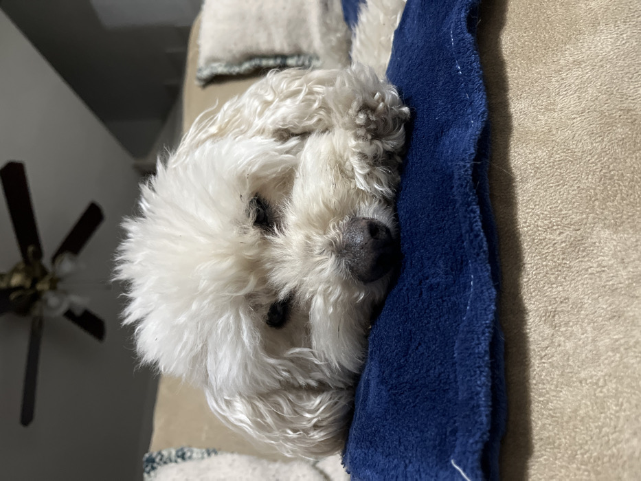 - "A fluffy white dog rests its head on a blue fabric" by FM-c5Nd33, licensed under CC BY 4.0