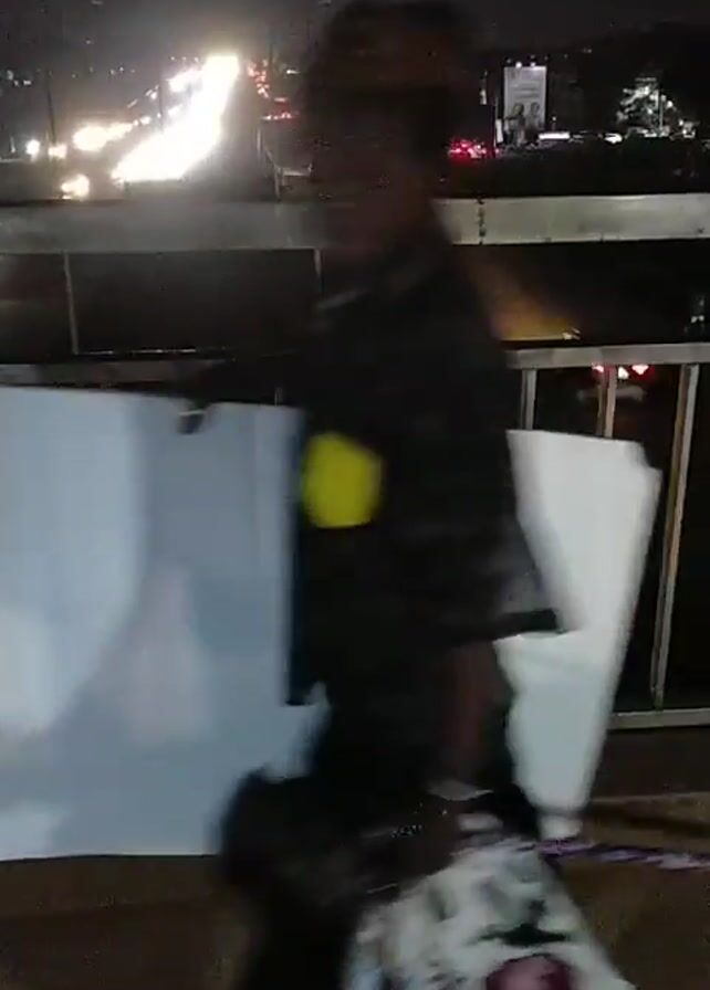The video appears to be taken from a pedestrian bridge overlooking a busy highway at night
