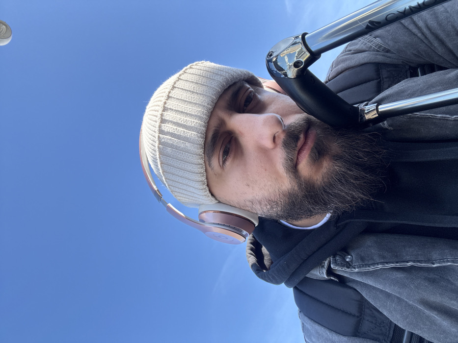 A close-up, low-angle selfie captures a male individual outdoors under a clear blue sky. The man, appearing to be in his mid-20s to 30s, has a dark, full beard and mustache. He wears a light beige ribbed beanie, rose gold Beats by Dre over-ear headphones, a dark hooded sweatshirt, and a dark grey or black quilted jacket with a black backpack strap visible over his left shoulder. His gaze is directed towards the camera with a neutral expression. A reflective metallic and black ergonomic object, possibly a handlebar or a support pole from a bicycle, scooter, or mobility aid, is partially visible in the lower right foreground. The specific location within the city of Caen, France, is not discernible from the visual information provided.