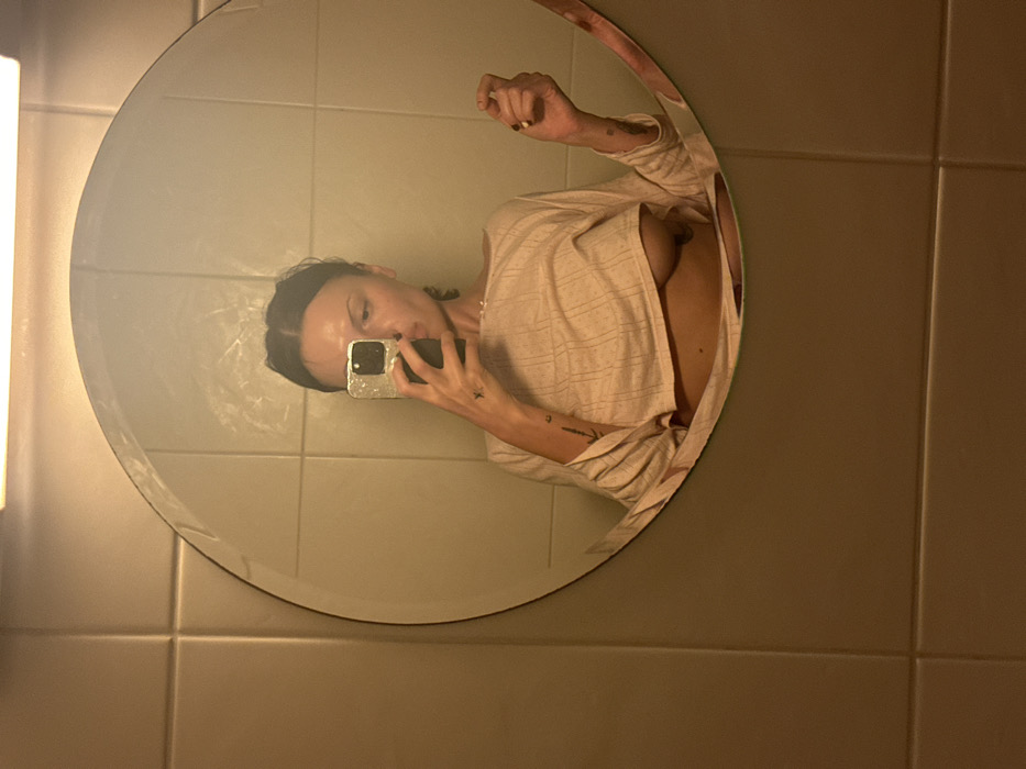 A female individual is depicted in a mirror selfie taken within a tiled room, identified as being in Wealden, United Kingdom