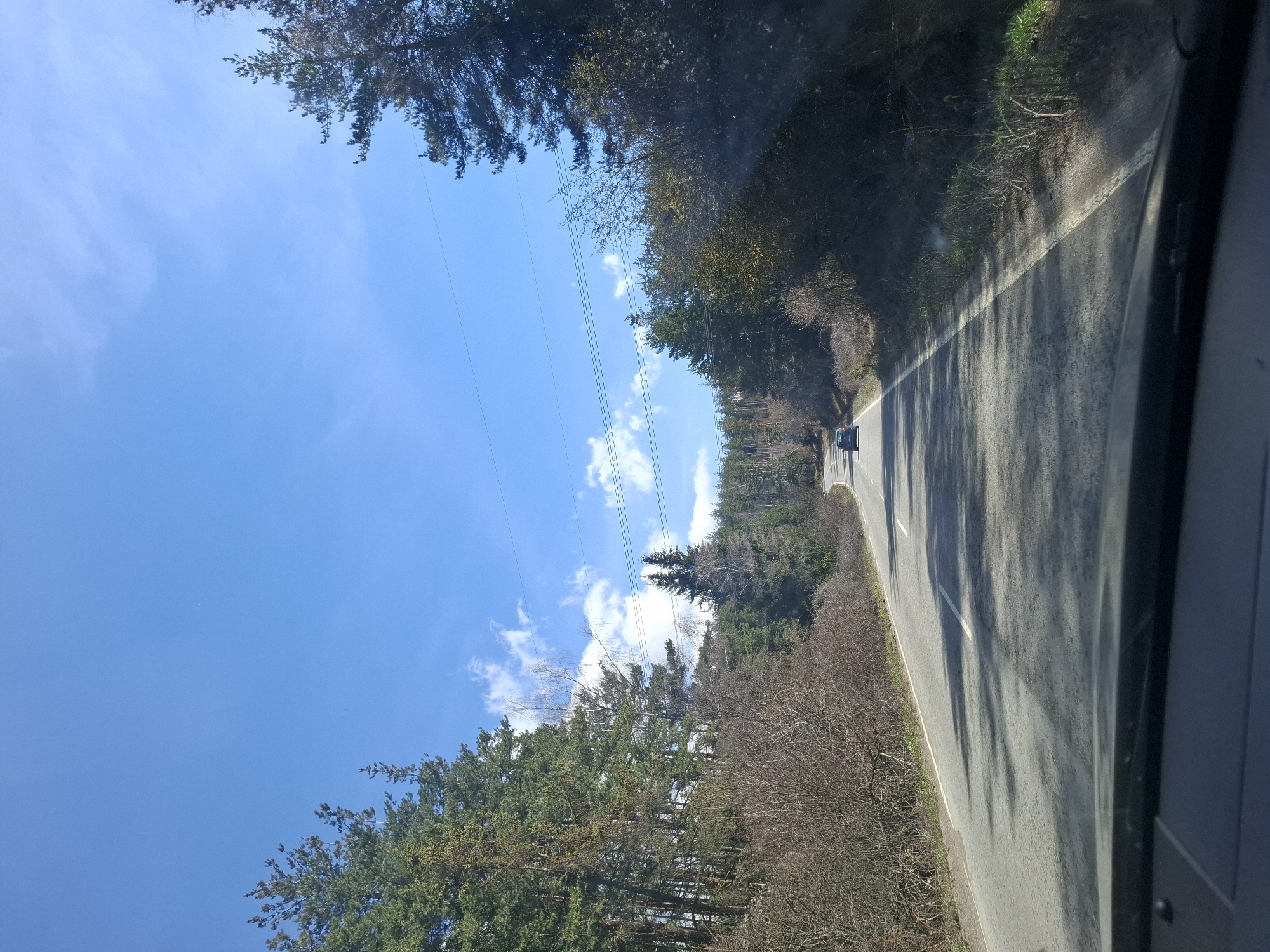 The image depicts a rural road near Manastirishte, Bulgaria. The road surface is asphalt and stretches ahead into the distance, curving slightly to the right. A white line marks the edge of the road. The view is likely from inside a vehicle. The sky is blue with scattered white clouds, and power lines stretch across the sky. Trees line both sides of the road. Some trees have green foliage, while others appear bare. A dark-colored vehicle is visible further down the road.