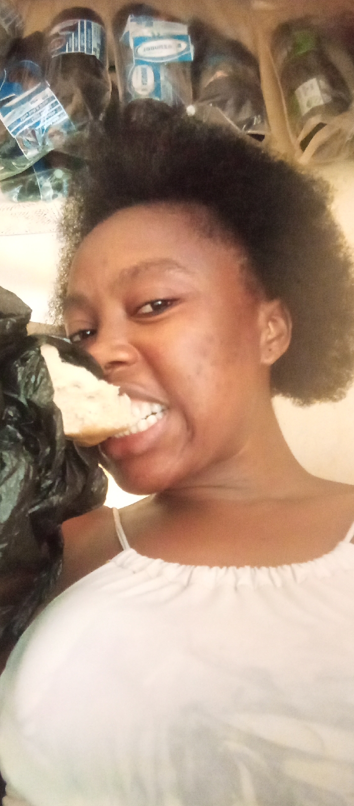 An image depicts a young woman with dark skin and dark, textured hair, captured in a close-up, chest-up view within an indoor setting in Nkpor, Nigeria. The subject is actively consuming a light-colored food item, consistent with bread, by biting into it. A black plastic bag is held by the subject's left hand, partially encasing the food. The subject's mouth is open, revealing white teeth engaged with the food. The individual wears a white top featuring thin straps and an elasticated neckline. Direct eye contact is maintained with the camera, accompanied by a partial smile/grin. The blurred background contains various items in clear plastic packaging, some displaying blue and white labels, and a distinct green container, indicative of a retail space or storage area.