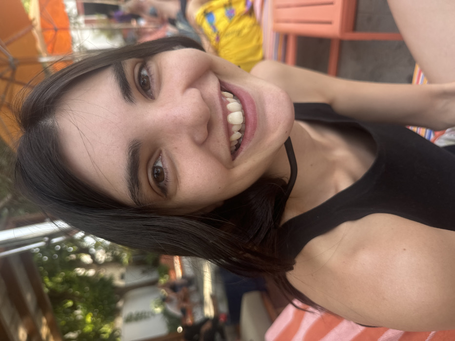 A young woman smiles brightly, her face angled slightly upward. She has dark hair and brown eyes. Her teeth are visible in her smile, with one noticeably whiter than the rest. She wears a black tank top. The background shows an outdoor setting with an orange umbrella, glimpses of other people, and some foliage, suggesting a relaxed, social gathering. The photo seems to be taken in a casual, candid moment.