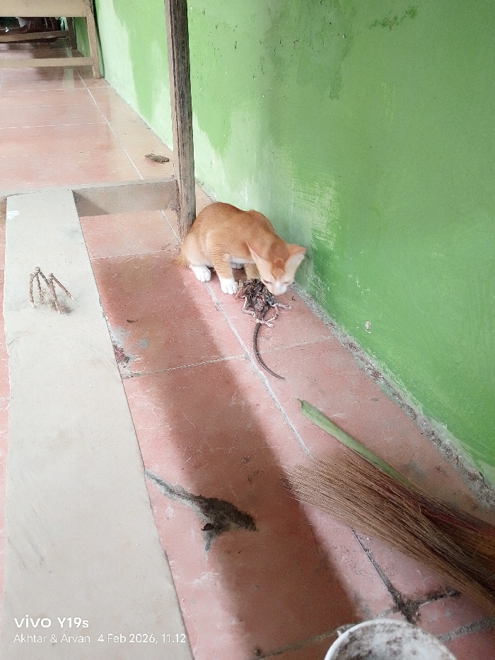 An orange tabby cat stands near a green wall, devouring prey. The prey appears to be a rodent or reptile, its body mangled. A broom lies nearby on the tiled floor, along with some debris. A spindly, makeshift object sits on a step to the left. The area suggests an outdoor or semi-outdoor setting. A smartphone watermark with a date is visible in the lower left corner.