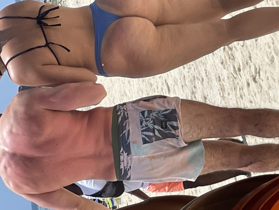 The image depicts a beach scene in Zanzibar, Tanzania, under bright daylight. In the foreground, two individuals stand facing away from the camera on light-colored sand. On the left, a fair-skinned male exhibits significant sunburn, with reddened skin visible across his back and shoulders. He wears light-colored board shorts featuring a multi-color, tropical leaf pattern and an olive green waistband; a "Billabong" logo is visible on a back pocket. His legs are hairy. To the right, a fair-skinned female wears a black string bikini top and a blue thong bikini bottom. Visible skin texture is present on her buttocks and thighs. In the background on the far left, a person with darker skin is partially visible, wearing a white t-shirt, orange shorts, and a black cross-body bag. Blue ocean water is discernible in the distant background.