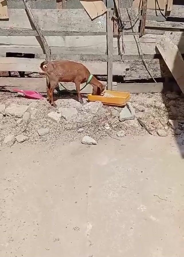 medium-sized brown goat eating from a yellow plastic tray on a sunny day. The goat is wearing a green collar. The tray is filled with what appears to be grain. The goat stands on a ground covered with small rocks and debris. Behind the goat is a makeshift wall constructed of wood planks and concrete blocks. Some ropes and other miscellaneous items are hanging on the wall. To the right is a concrete ground. A child can be heard speaking in the background.