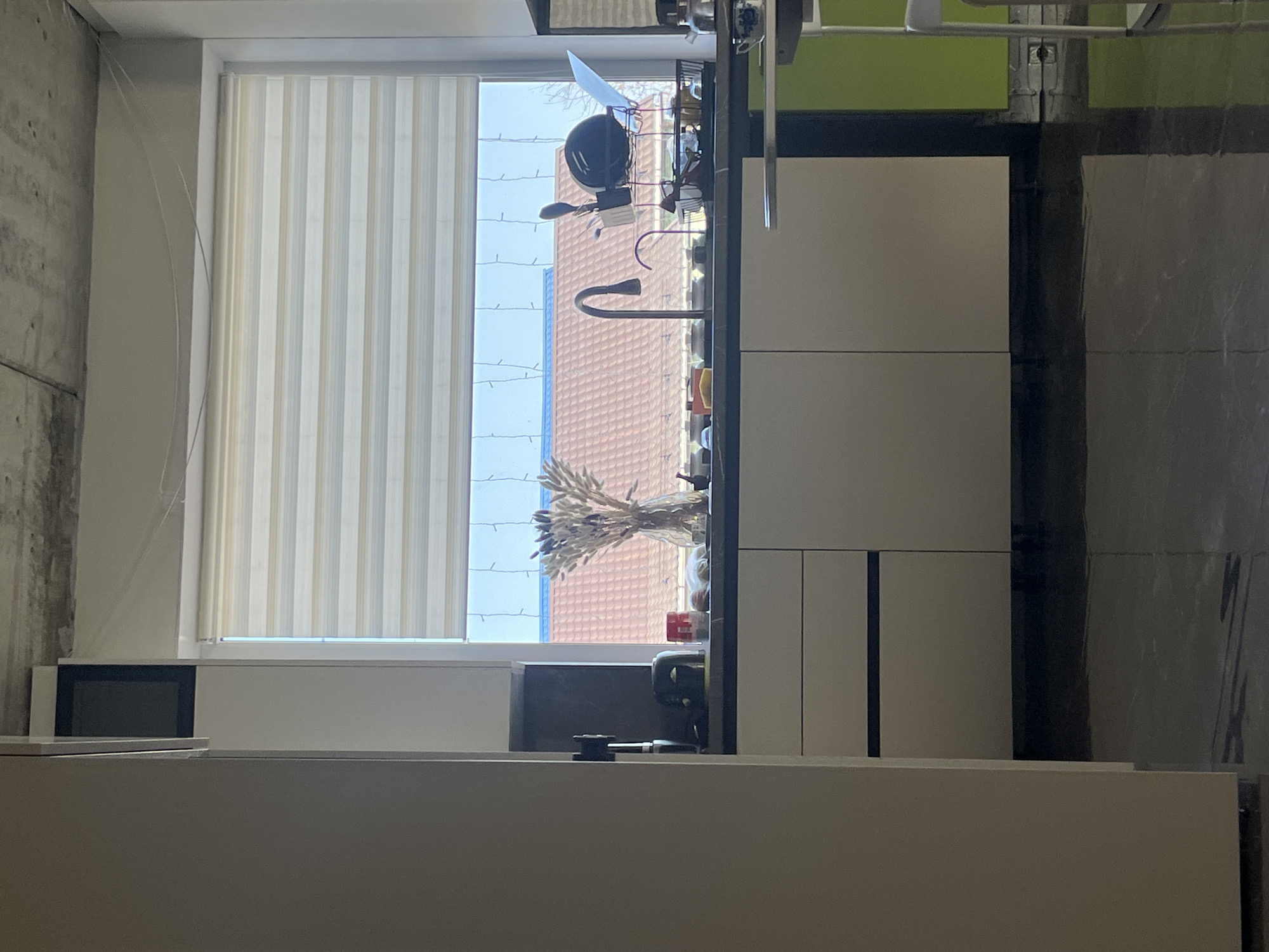 This image depicts an interior view of a kitchen in Kladovitsy, Russia. No individuals are present. The scene is dominated by a large window in the background, partially covered by horizontally striped blinds in alternating light and dark beige tones. Through the uncovered lower section of the window, a terracotta-tiled roof of an adjacent building is visible beneath a clear blue sky. A string of decorative lights is suspended horizontally across the inner surface of the windowpane. Below the window, a dark countertop, possibly granite or a similar material, features a prominent dark-colored gooseneck faucet positioned over an integrated sink. To the left of the faucet, a clear glass vase contains a bouquet of dried, light-colored grasses. To the right of the faucet, a black wire dish drying rack holds various kitchen items, including dark plates and utensils. Other objects on the countertop include a dark-colored toaster, a red container, and additional small items. The kitchen cabinetry comprises light-colored, flat-front lower units with dark horizontal lines, possibly recessed handles. A section of wall painted a vibrant green is visible on the far right. The flooring is dark, reflective, and appears to be polished concrete or dark tiles. The ceiling overhead is unfinished concrete, showing visible structural elements. A large, light-colored vertical panel, likely part of a cabinet or appliance, occupies the left side of the foreground.
