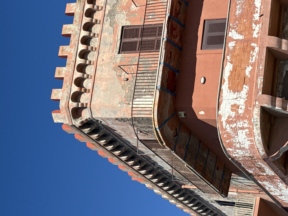 The image displays a multi-story building in Anzio, Italy, under a clear blue sky. The structure features a faded reddish-orange exterior, characterized by a crenellated roofline with decorative arched recesses immediately below the parapet. Significant paint peeling is evident across all visible surfaces, exposing lighter underlying plaster and reddish brickwork in various areas. Two curved balconies project from the facade. The upper balcony is equipped with dark, rusted metal railings, and its underside reveals blue-colored supports and extensive paint deterioration. Adjacent to this upper balcony, a window with closed dark brown louvered shutters is visible. Below, a lower curved balcony also exhibits widespread peeling white paint over the red-orange facade, revealing brick patterns. Another window with closed dark brown louvered shutters is situated on the lower level, positioned to the right of the lower balcony. Multiple white, oval-shaped exterior light fixtures are mounted on the building's facade. No individuals, activities, or additional objects are present in the scene.