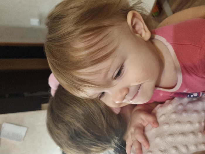 A young girl, facing right, wears a pink shirt. Her blonde hair is styled with bangs. She’s positioned with her head resting on another person's shoulder. The second person, with darker brown hair and a pink hair accessory, is partially visible. The girl's hands are clasped on a textured, light-colored fabric. A wooden cabinet and a white object are slightly visible in the background.