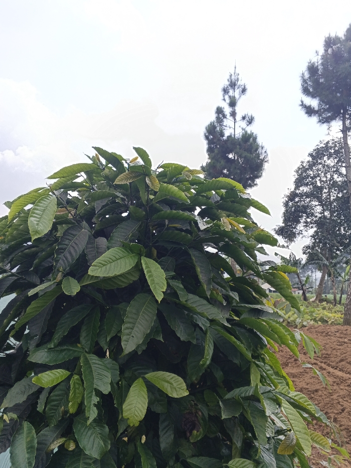 A lush, leafy bush dominates the foreground, its dark green leaves densely packed. Behind it, three tall trees punctuate the sky, including two evergreens. In the background, an overcast sky provides a soft, diffused light. The ground near the bush shows cultivated soil. Other vegetation is seen at a distance.