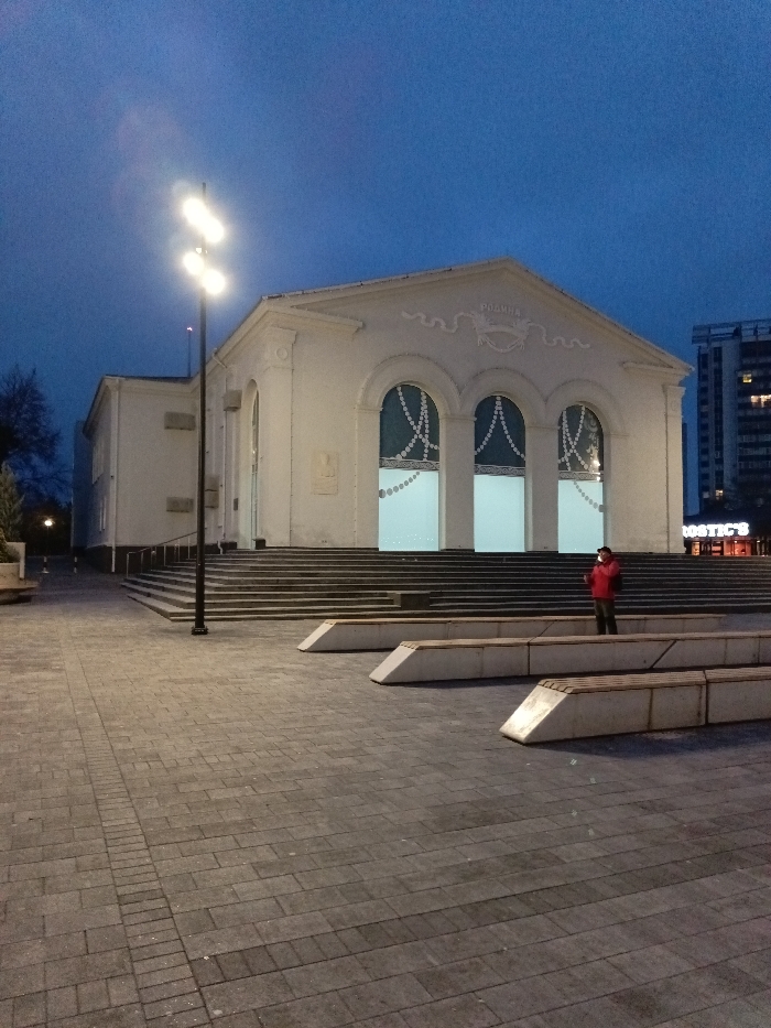 The image depicts the Rodina Cinema located at ul. Krymskaya, 14, Anapa, Krasnodar Krai, Russia, at twilight or early evening. The central subject is a light-colored, classical-style building with a prominent pediment atop its front facade, bearing the Cyrillic word "РОДИНА" (Rodina) and decorative scrollwork. Three large arched window/doorways on the facade are internally illuminated with a blue-white light and feature decorative pearl-like hangings. A smaller, plainer section of the building extends to the left. A large, wide set of dark-toned steps leads up to the building's main entrance. In the foreground, a paved plaza area consists of grey interlocking pavers. Three long, rectilinear public benches with light-colored wooden seats and concrete/stone bases are arranged in parallel rows, stepping down from left to right, on the plaza surface. A tall, black street light with two vertical, illuminated fixtures stands to the left of the central steps. A single individual is present, standing on the steps directly in front of the central arched entrance. The person is wearing a red jacket and dark trousers, and appears to be holding a white object to their mouth or face. In the background to the right, a modern, multi-story building with several illuminated windows is visible. Below it, a partial red-lettered sign reading "OSTIC'S" (likely part of a larger word) is illuminated at street level. To the left, a bare-branched tree and some evergreen shrubbery are visible. The sky is a deep, clear blue, characteristic of twilight.