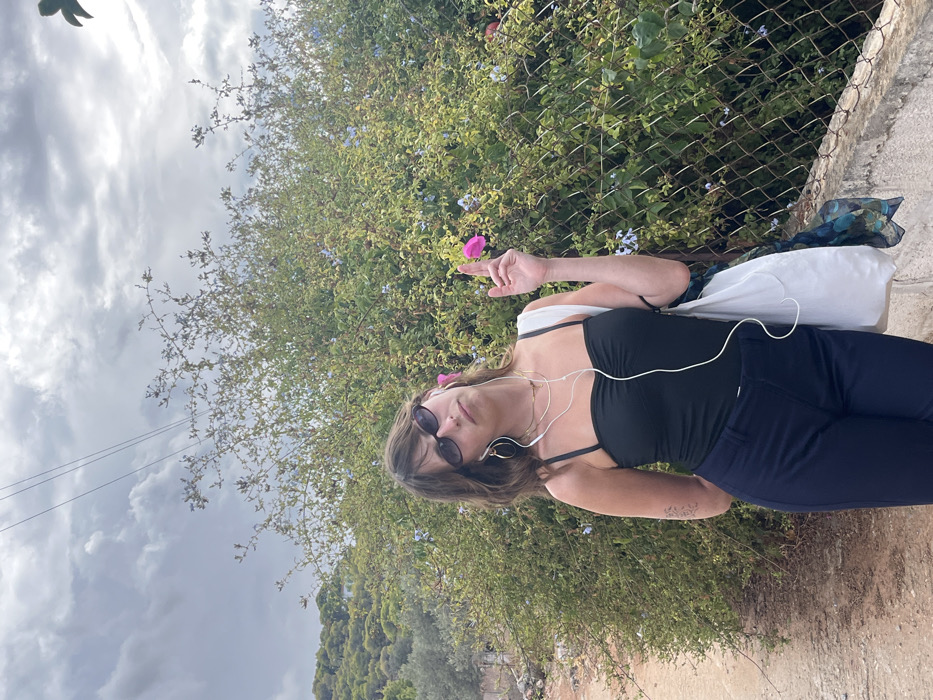 The image displays a young female individual standing outdoors in Megalochori, Greece, against a backdrop of dense green foliage